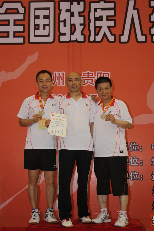 圖為我省站立四級運動員劉忠(左一)高潮(右一)榮獲男雙銀牌,劉忠獲得男單銀牌,李強(中)榮獲站立三級男單銅牌