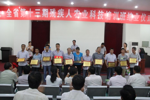 圖為全省第十三期殘疾人農業科技培訓班結業儀式上為科技示范戶授牌