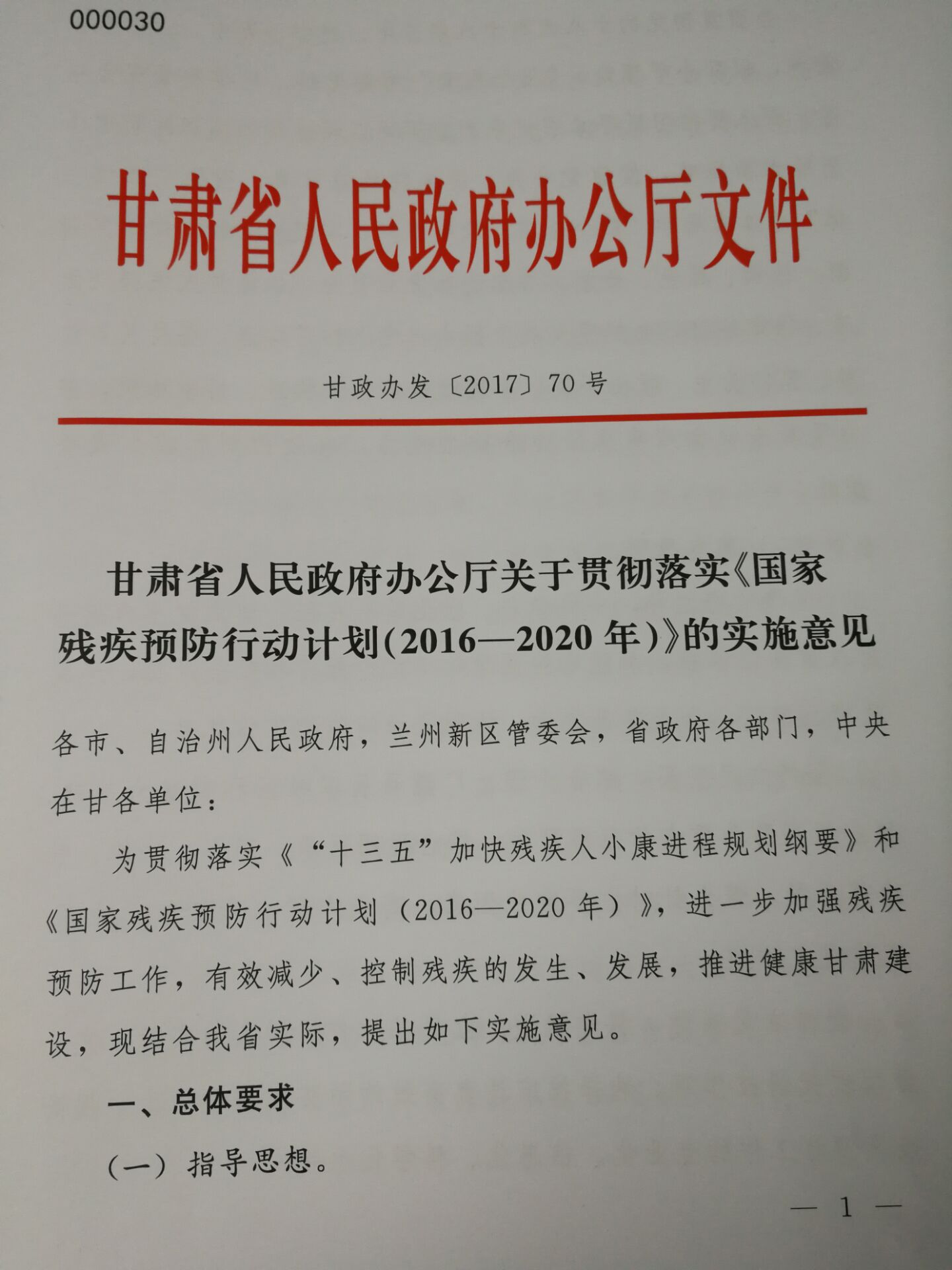 近日,為認真貫徹落實《國家殘疾預防行動計劃(2016—2020年)》,甘肅省人民政府制定出臺了《甘肅省貫徹落實〈國家殘疾預防行動計劃(2016-2020年)〉實施意見》(甘政辦發〔2017〕70號)。《實施意見》從總體要求、主要行動、保障措施、督導檢查以及各部門、各單位的工作職責都提出了具體措施,做出了明確要求,對我省殘疾預防與個人健康、家庭幸福、經濟社會的健康發展,以及全面推進殘疾人小康進程具有重要意義。