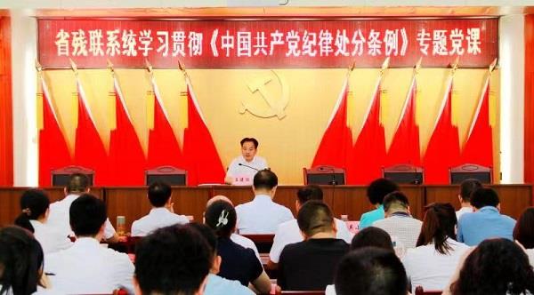 省殘聯黨組書記、理事長王建強,以學習貫徹《中國共產黨紀律處分條例》和《中國共產黨組織處理規定(試行)》為主題進行授課,省殘聯黨組成員、副理事長蔣錄基、宋保才、曾占奎、吳小萍,一級巡視員張恩和、二級巡視員姚禮,省紀委監委派駐省民政廳紀檢監察組相關領導干部,機關全體黨員干部、直屬單位副縣級以上干部百余人參加學習。
