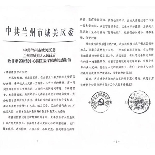 中共蘭州市城關區委 蘭州市城關區人民政府向省康復中心醫院致感謝信