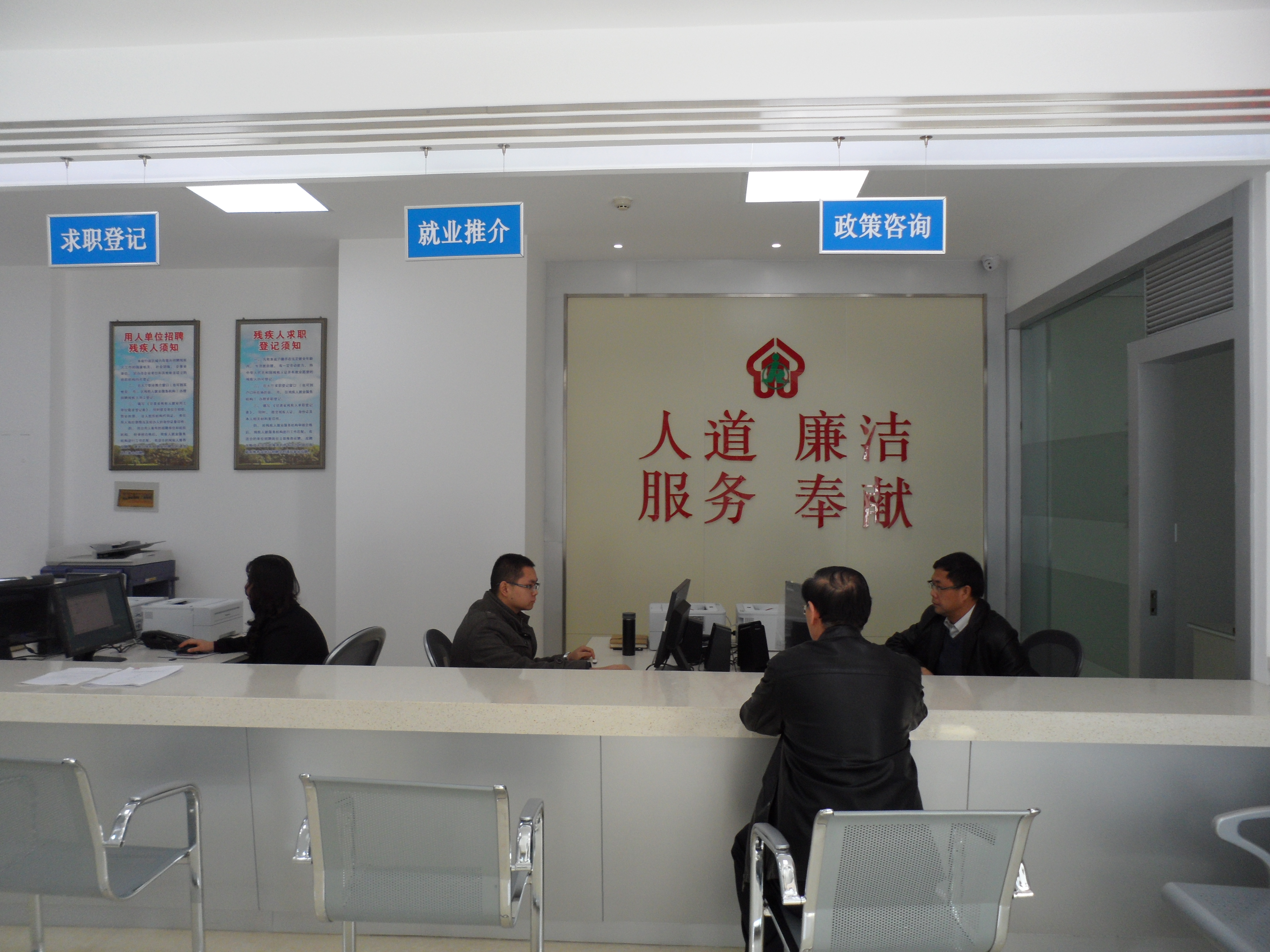 為了進一步促進殘疾人就業工作,根據中殘聯就業服務機構規范化建設要求,在省殘聯和省人社廳領導的重視支持下,省殘疾人就業服務大廳于2014年11月1日建立并投入試運行。大廳占地面積100平方米,由省人社廳提供(位于蘭州市皋蘭路305號,省人才市場綜合大樓一樓)。大廳暫設四個窗口,有政策咨詢、求職登記、就業推介、就業年審等。希望有需求的殘疾人就業單位和殘疾人前來大廳聯系登記,也希望全社會積極關注支持殘疾人就業工作,為促進殘疾人就業積極貢獻力量。即日大廳面向全社會殘疾人提供試運行服務,計劃2015年2月利用全國殘疾人就業援助月活動正式投入運行。