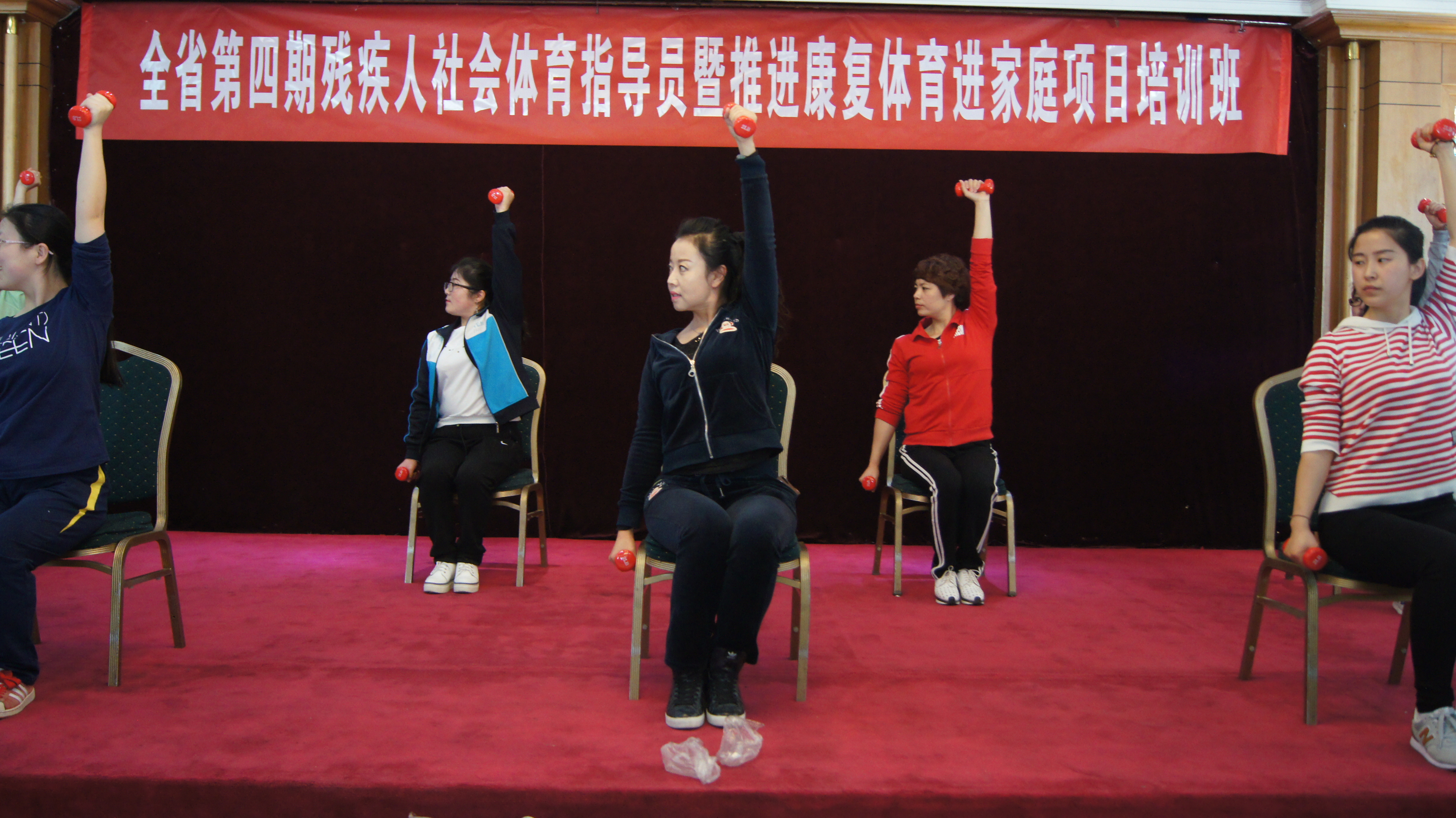 圖為培訓(xùn)班學(xué)員在實(shí)操課上認(rèn)真練習(xí)殘疾人啞鈴操
