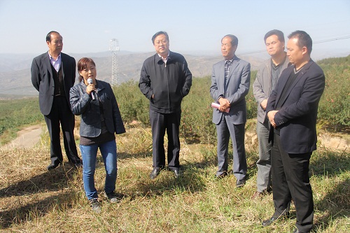 圖為殘疾人學員在天水市秦安縣劉坪何灣萬畝優質蜜桃基地認真聽秦安縣果業局局長徐保祥介紹基地建設情況