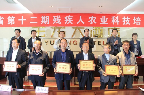 圖為全省第十二期殘疾人農業科技培訓班結業儀式上為科技示范戶授牌