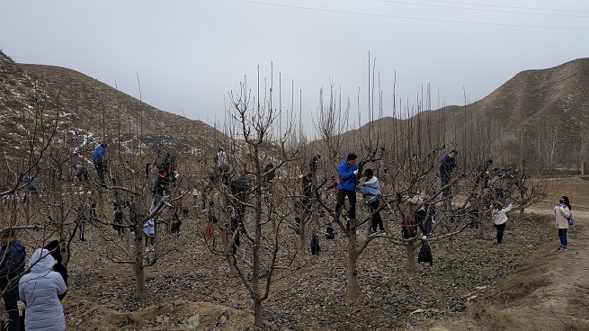 此次實(shí)習(xí)正值初冬時(shí)節(jié),又剛逢降雪,果園內(nèi)寒風(fēng)凜冽,但實(shí)習(xí)師生仍一絲不茍,熱情飽滿,整個(gè)示范基地充滿了歡聲笑語,呈現(xiàn)出一片熱火朝天的景象,學(xué)生們蓬勃向上的精神狀態(tài),為寒冷的果園增添了一道靚麗的風(fēng)景線。在剪枝過程中,我中心干部職工積極參與,抓住機(jī)會向農(nóng)大教授請教,與學(xué)生們一起動手實(shí)踐,學(xué)習(xí)了果樹修剪技術(shù),明確了果樹整形修剪的重要性,掌握了果樹修剪因樹制宜,隨勢做型的要領(lǐng),進(jìn)一步提高了專業(yè)技能。